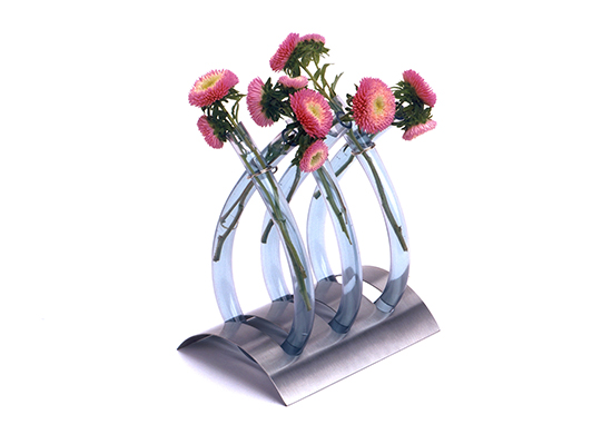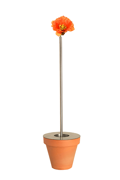 „Otupussi“ ist eine Objekt-Vase mit vielen Tentakeln : beliebig erweiterbar, kombiniert hartes Edelstahl und weichen PVC-Schlauch für das individuelle Arrangement von Einzelblüten. Gehalten/fixiert werden die beweglichen „Arme“ durch Schlüsselringe.